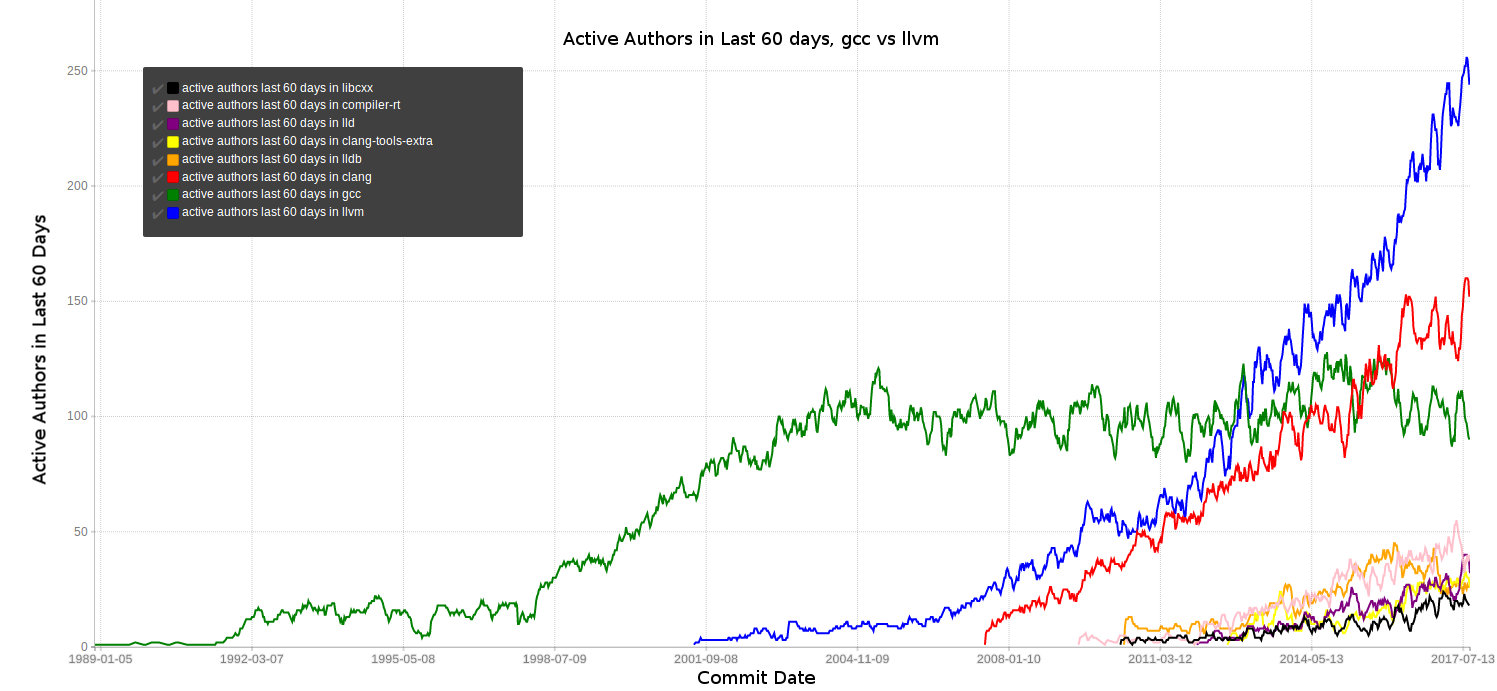 Active number of authors in the last 60 days. Graph by Nick Desaulniers from his blog. These might not be exact numbers, but show a good trend of the active dev community.