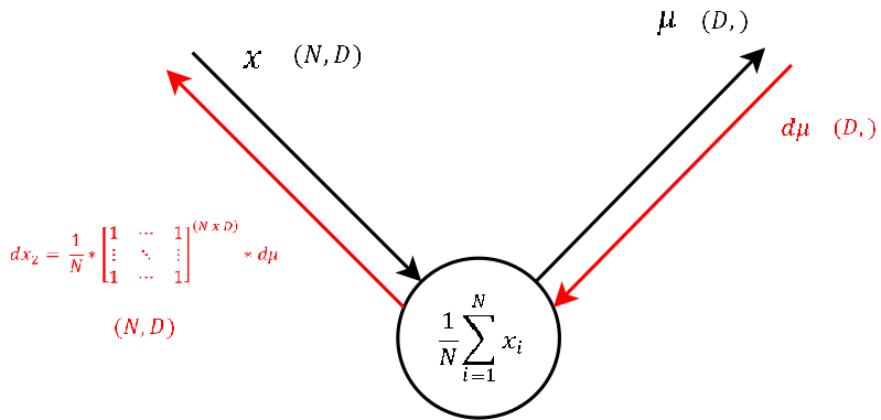 The function of this node is exactly the same as of step 4. Only that during the forward pass the input was `x` - the input to the BatchNorm-Layer and the output here is `mu`, a vector that contains the mean of each feature.