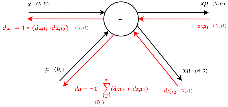 Now this looks like a more fun gate! two inputs-two outputs! This node subtracts the per-feature mean row-wise of each trainings example `n for n in [1...N]` during the forward pass.