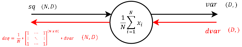 Also a "one input-one output" node. During the forward pass the output of this node is the variance of each feature `d for d in [1...D]`.