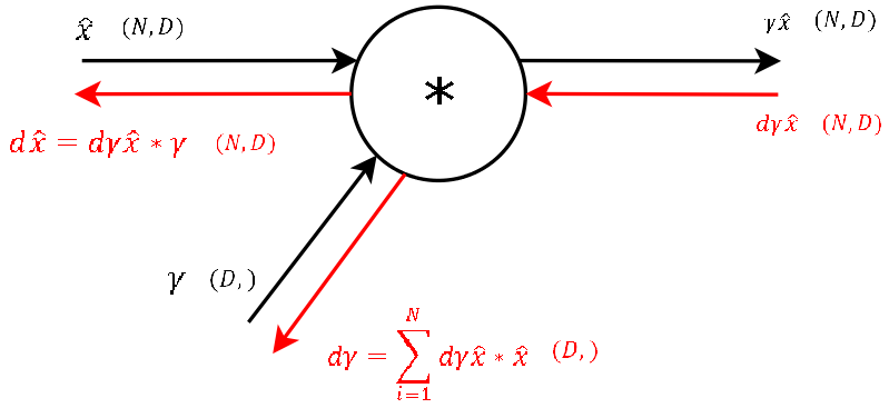 Next follows the backward pass through the multiplication gate of the normalized input and the vector of gamma.