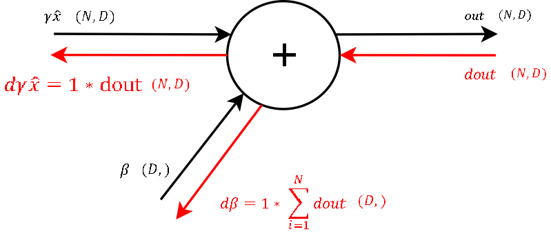 Backwardpass through the last summation gate of the BatchNorm-Layer. Enclosed in brackets I put the dimensions of Input/Output